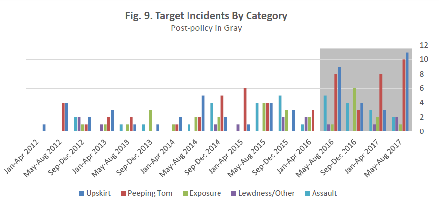 The top sexual offenses the study tracked were upskirt incidences, Peeping Tom incidences (voyeurism), and men exposing their bodies to women. The study tracked over 200 reported incidences between 2003 and 2017 from Target bathrooms. The study showed that “women and children comprised 99.1% of victims in the offenses,” 34% of those being children.